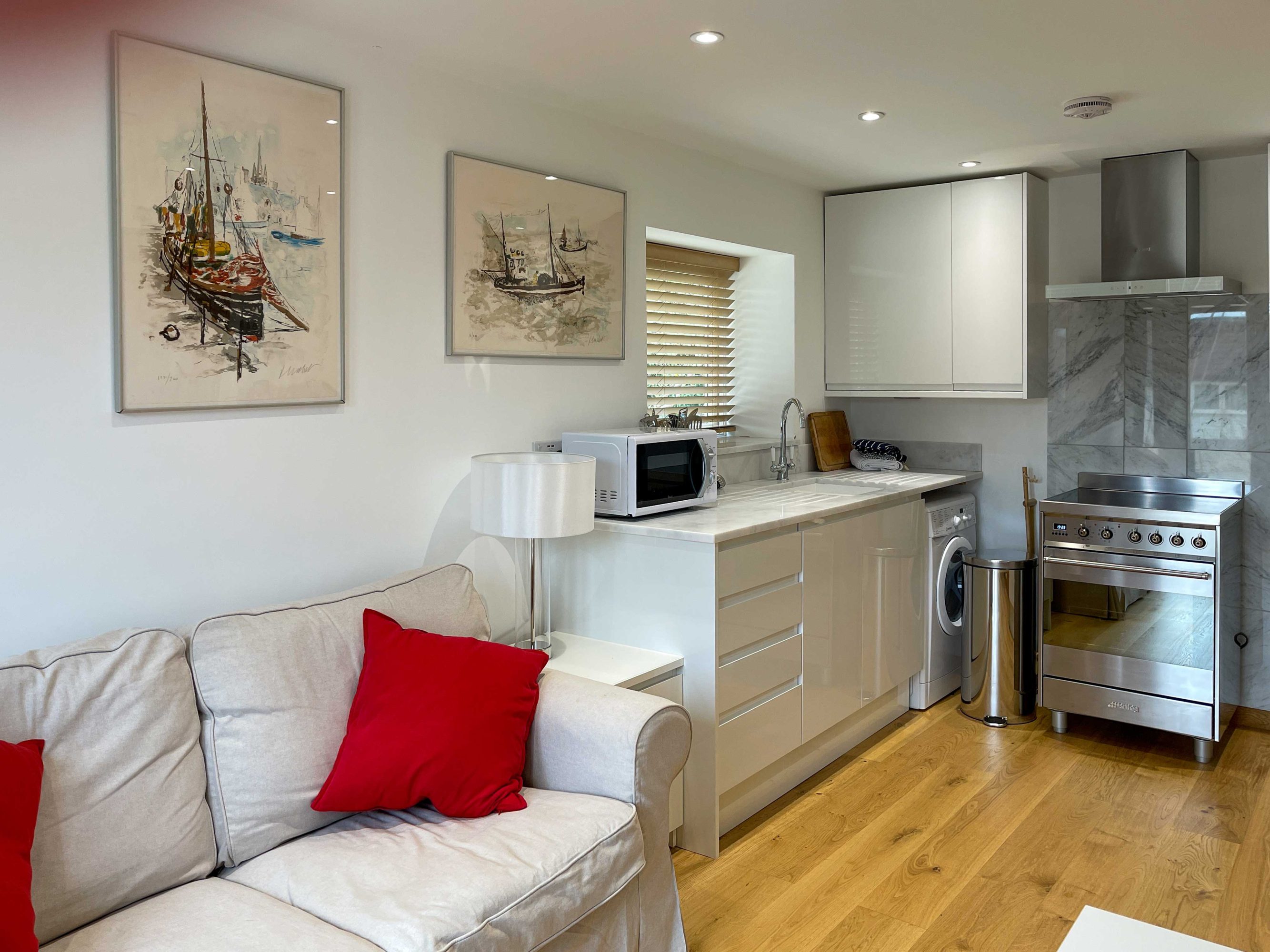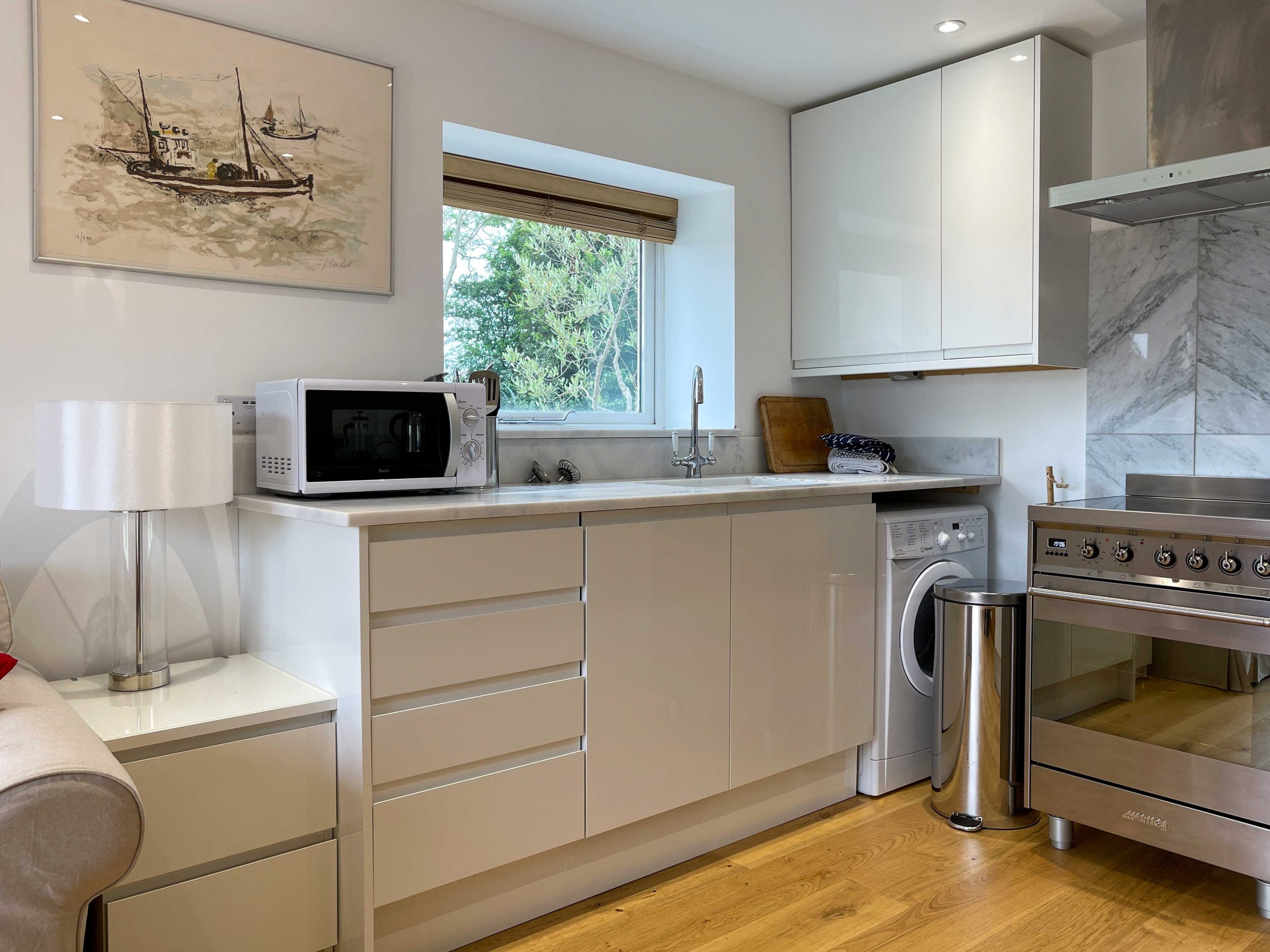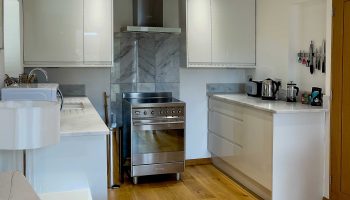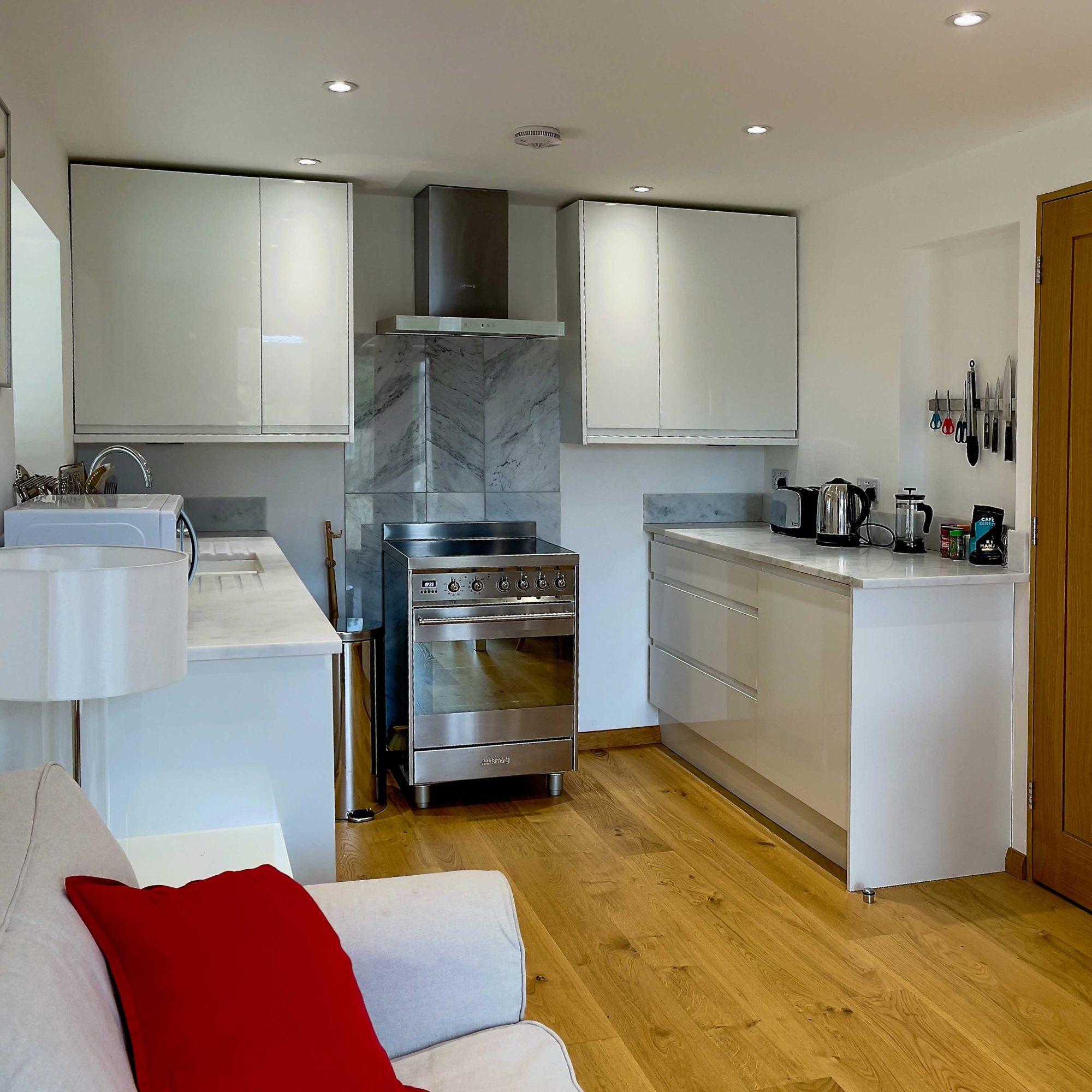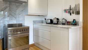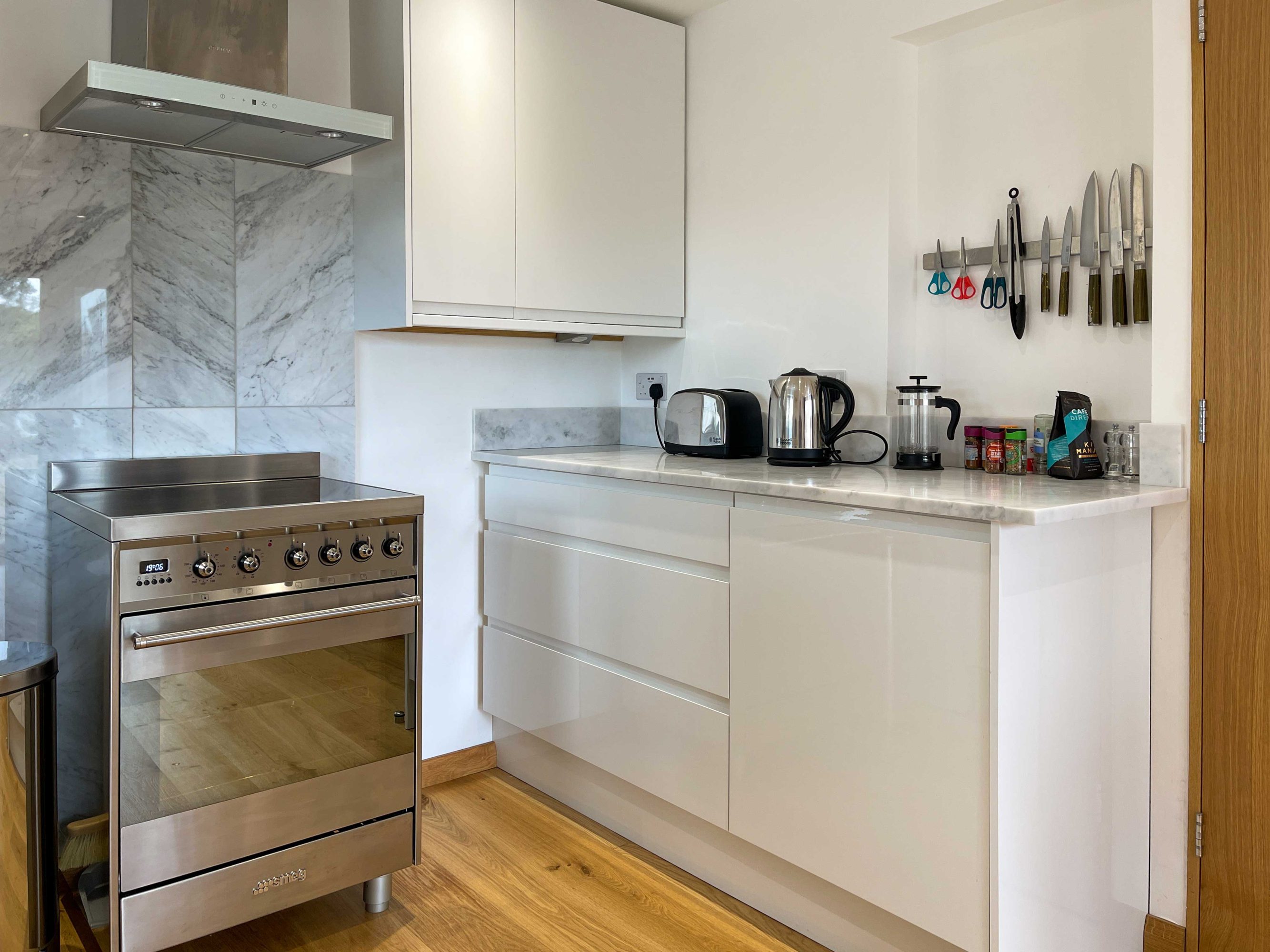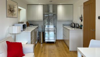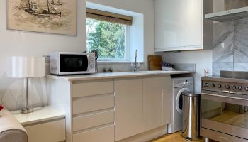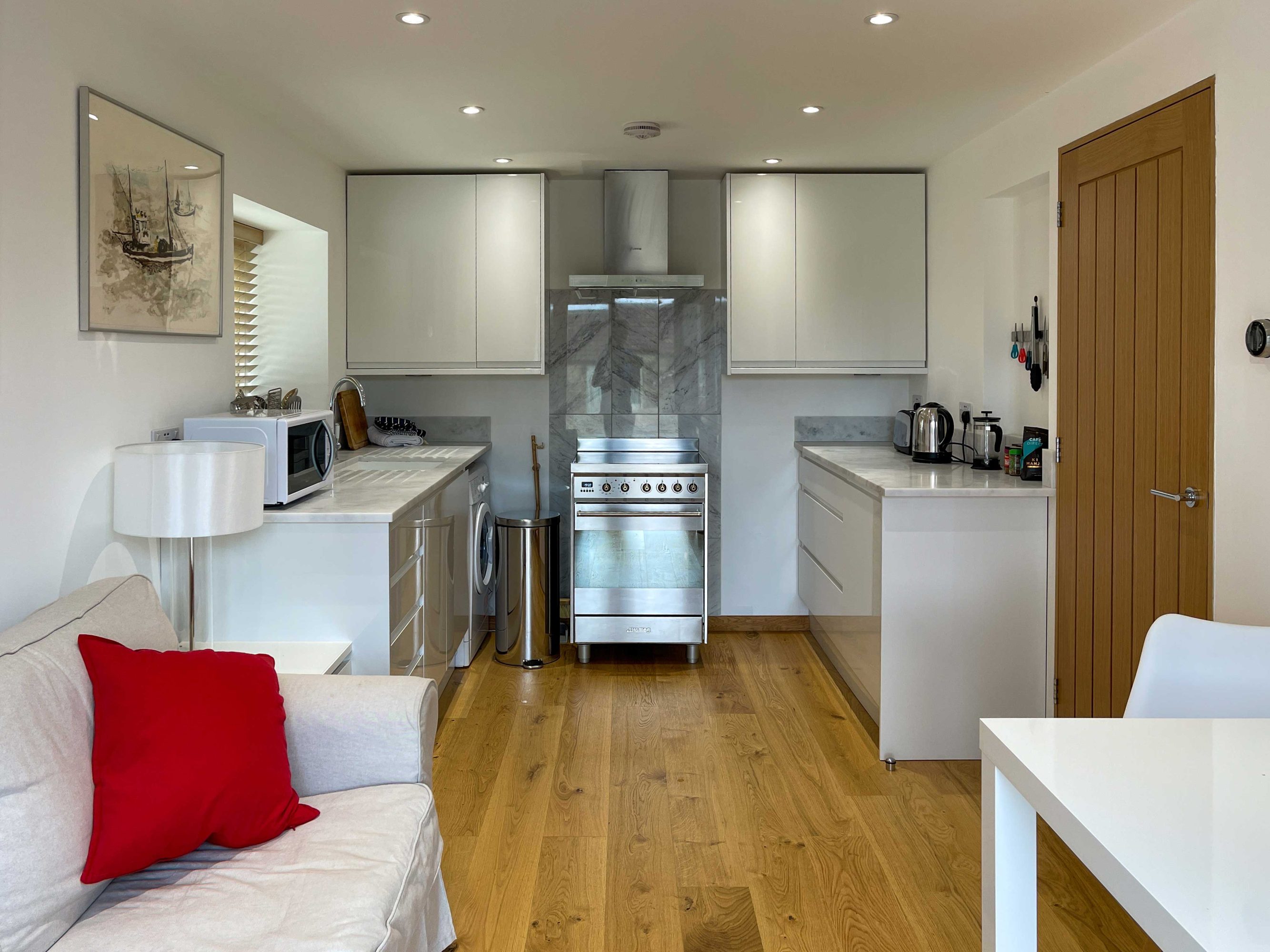 The kitchen has most of the things you would expect at home including a Kenwood mixer in case you wish to really spend time cooking whilst staying in Whitley Old Garage. Or go to or come back from the local pub with a take-away. You do not need any equipment from home including a fully integrated dishwasher, a small microwave, a fridge with small freezer, a freestanding top of the range induction Smeg 600mm wide hob stove with ducted extractor, one and a half integrated sinks in the Carrara Mable style minerva tops. Plates, cutlery, sauce pans etc all in the drawers and cupboards.