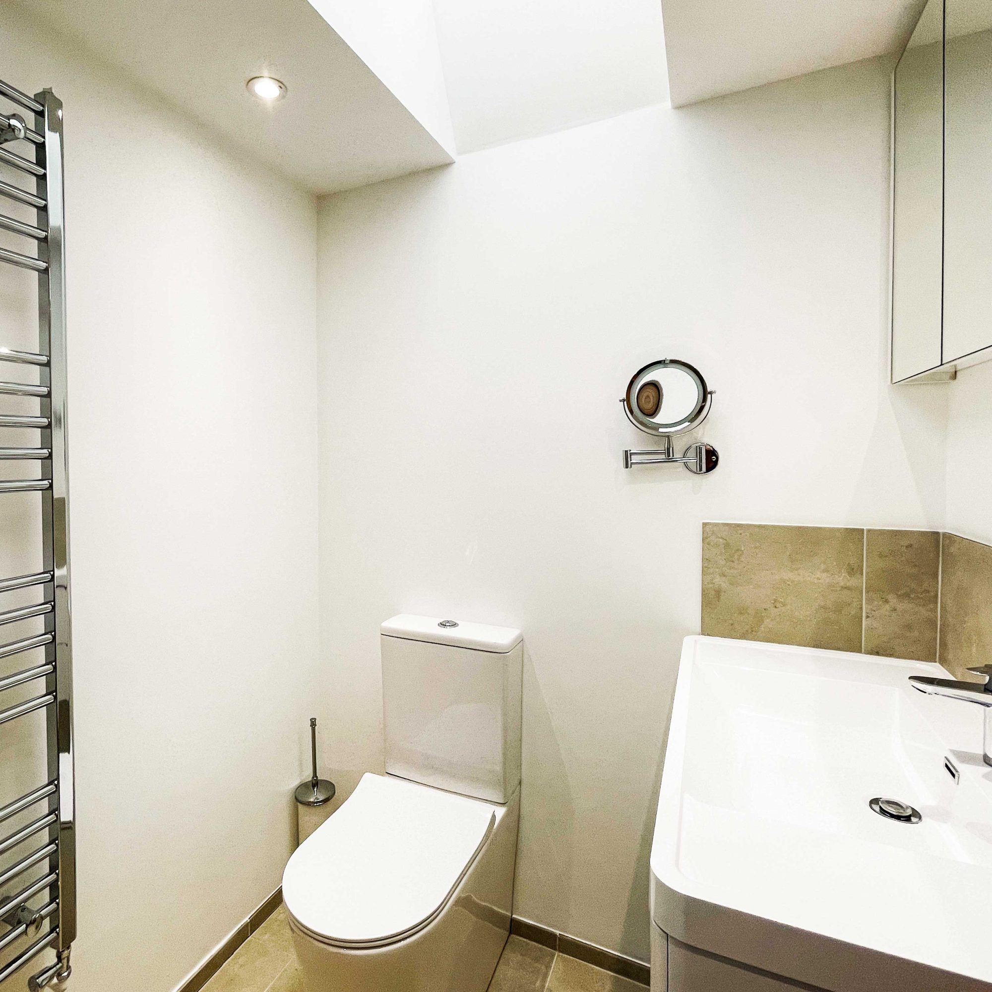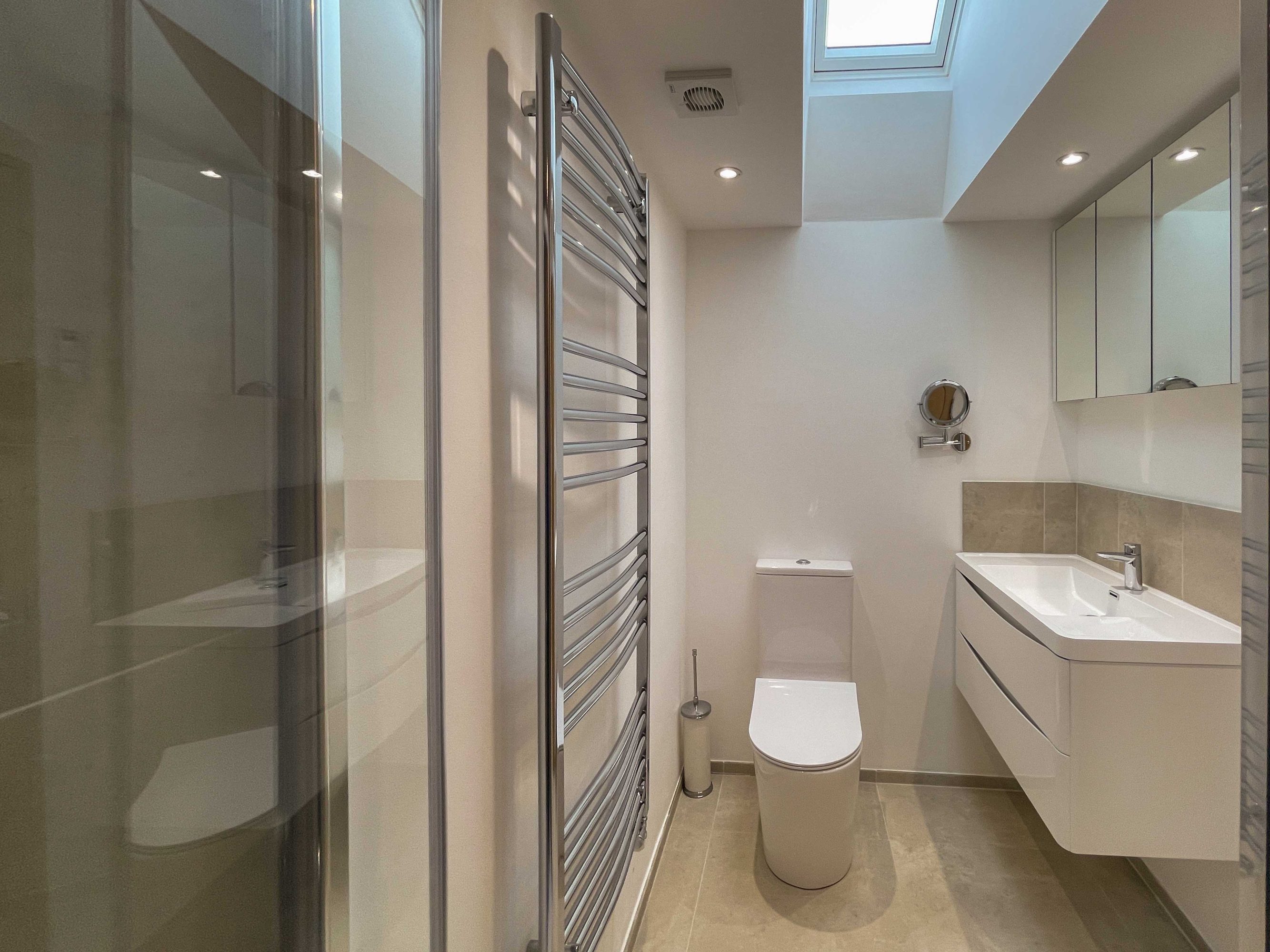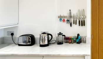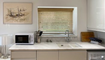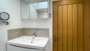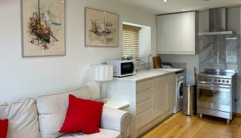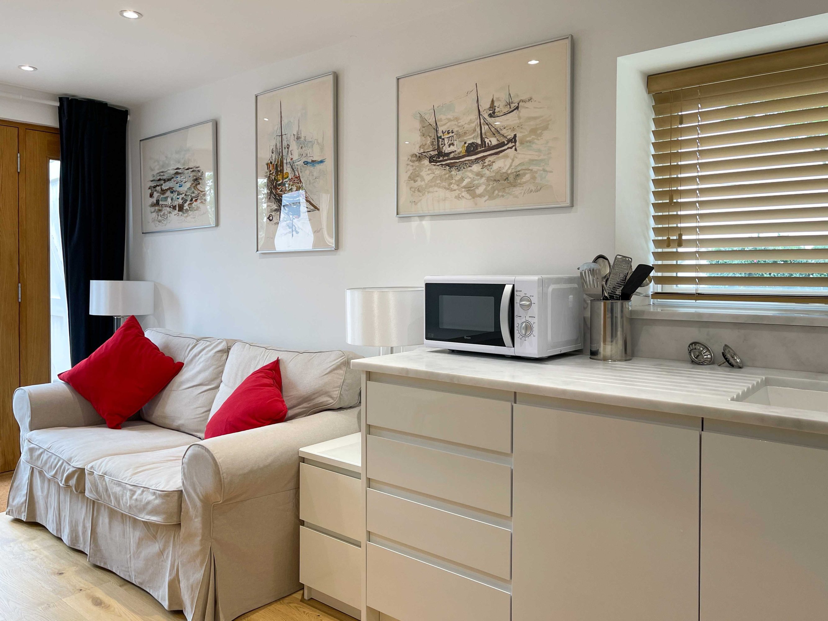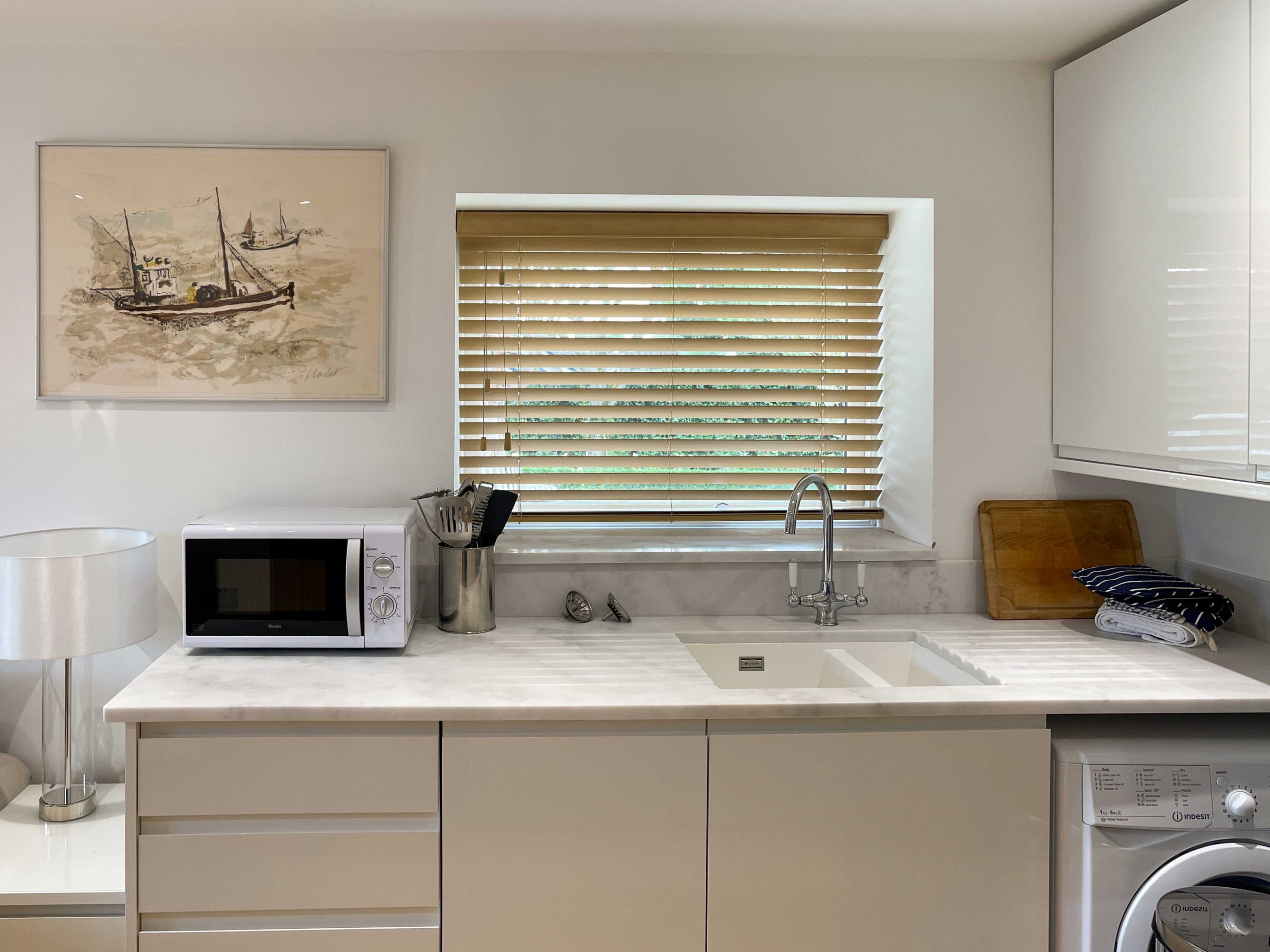The kitchen has most of the things you would expect at home including a Kenwood mixer in case you wish to really spend time cooking whilst staying in Whitley Old Garage. Or go to or come back from the local pub with a take-away. You do not need any equipment from home including a fully integrated dishwasher, a small microwave, a fridge with small freezer, a freestanding top of the range induction Smeg 600mm wide hob stove with ducted extractor, one and a half integrated sinks in the Carrara Mable style minerva tops. Plates, cutlery, sauce pans etc all in the drawers and cupboards.