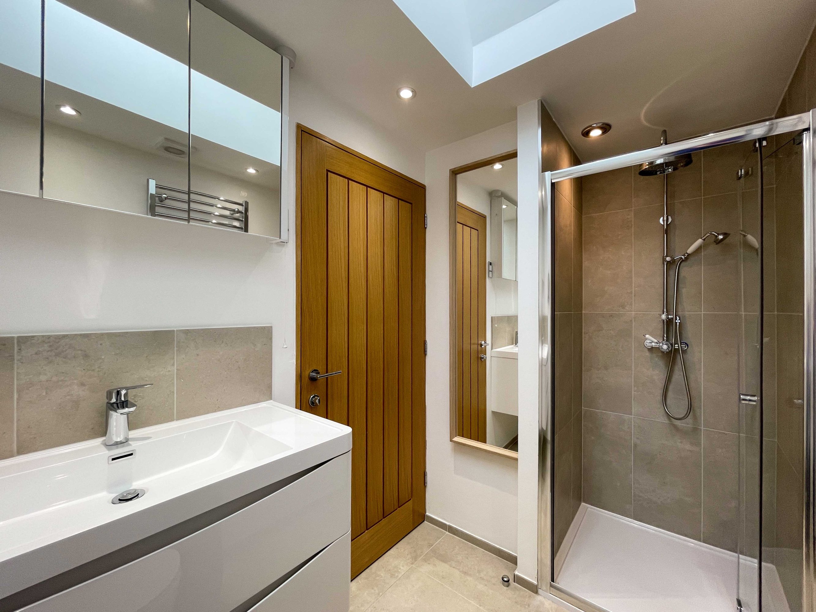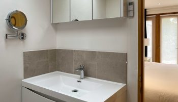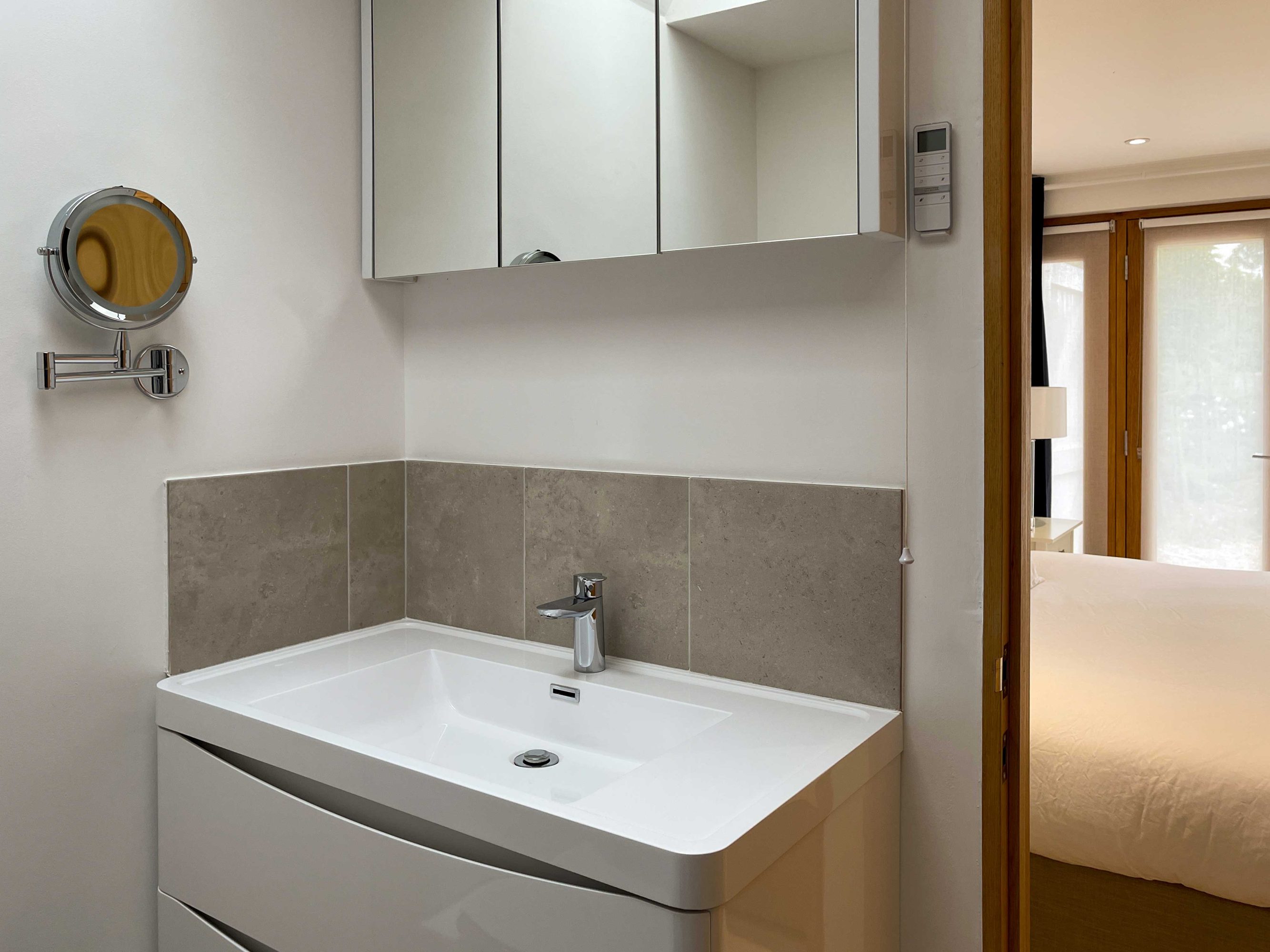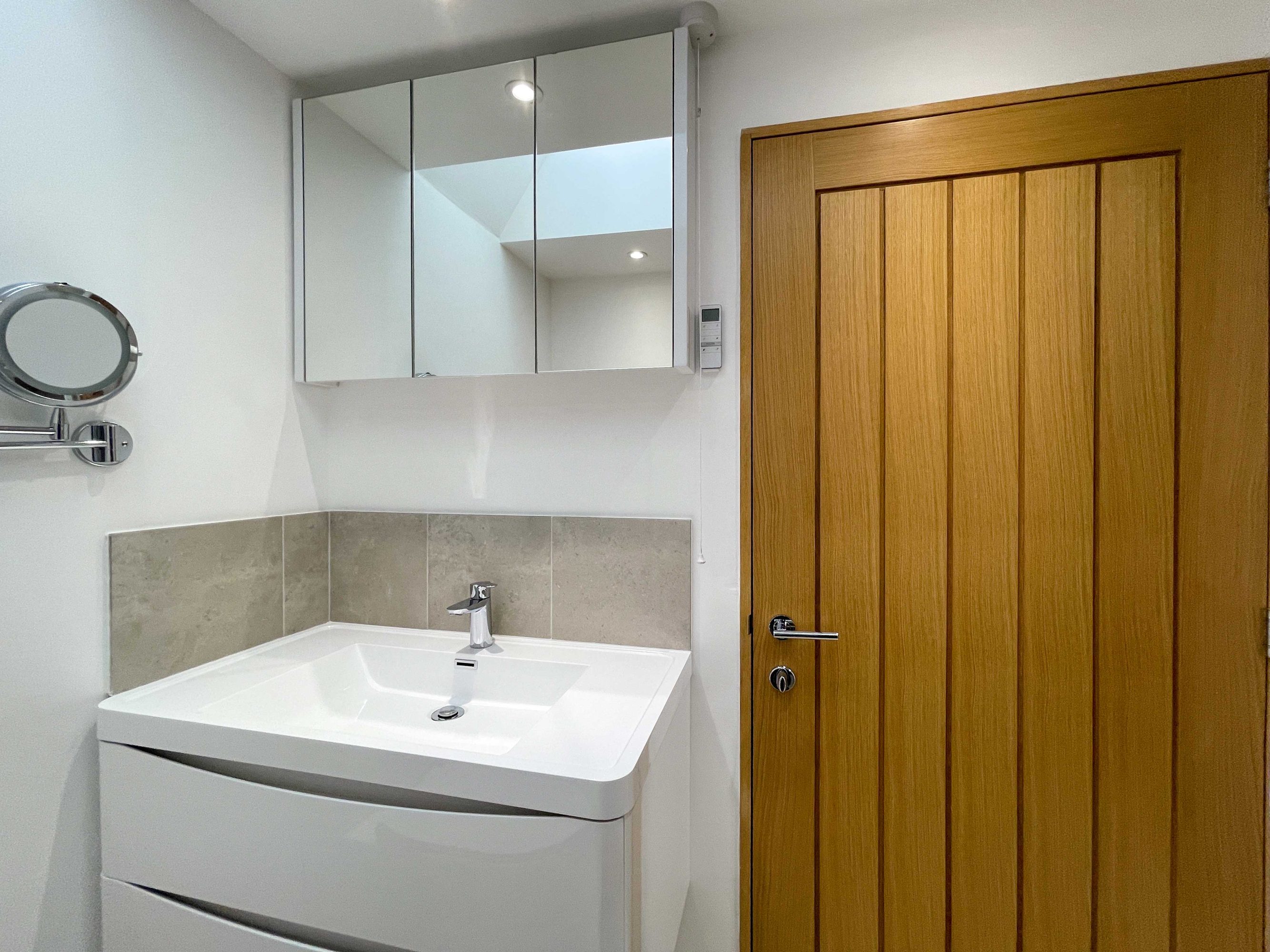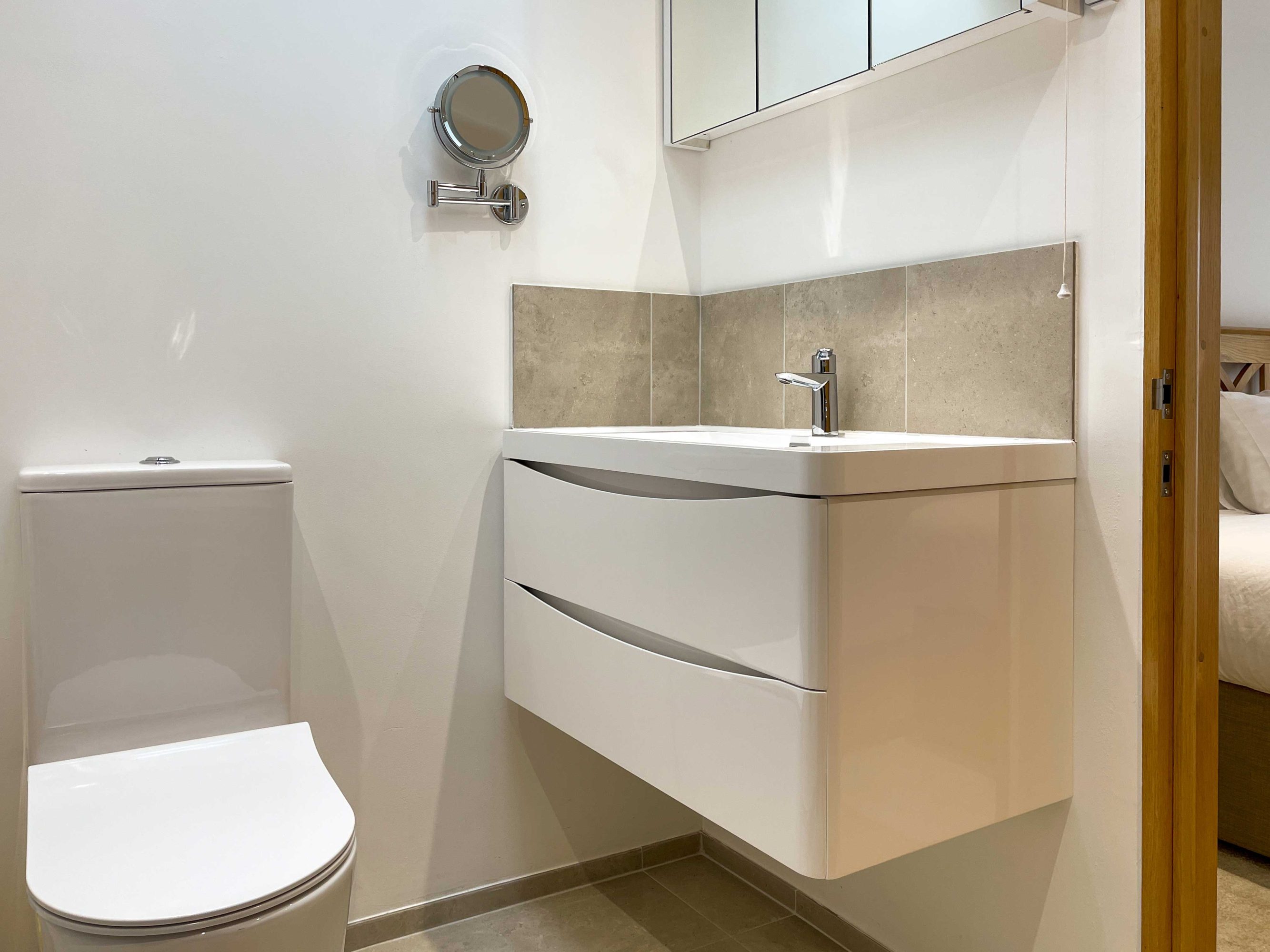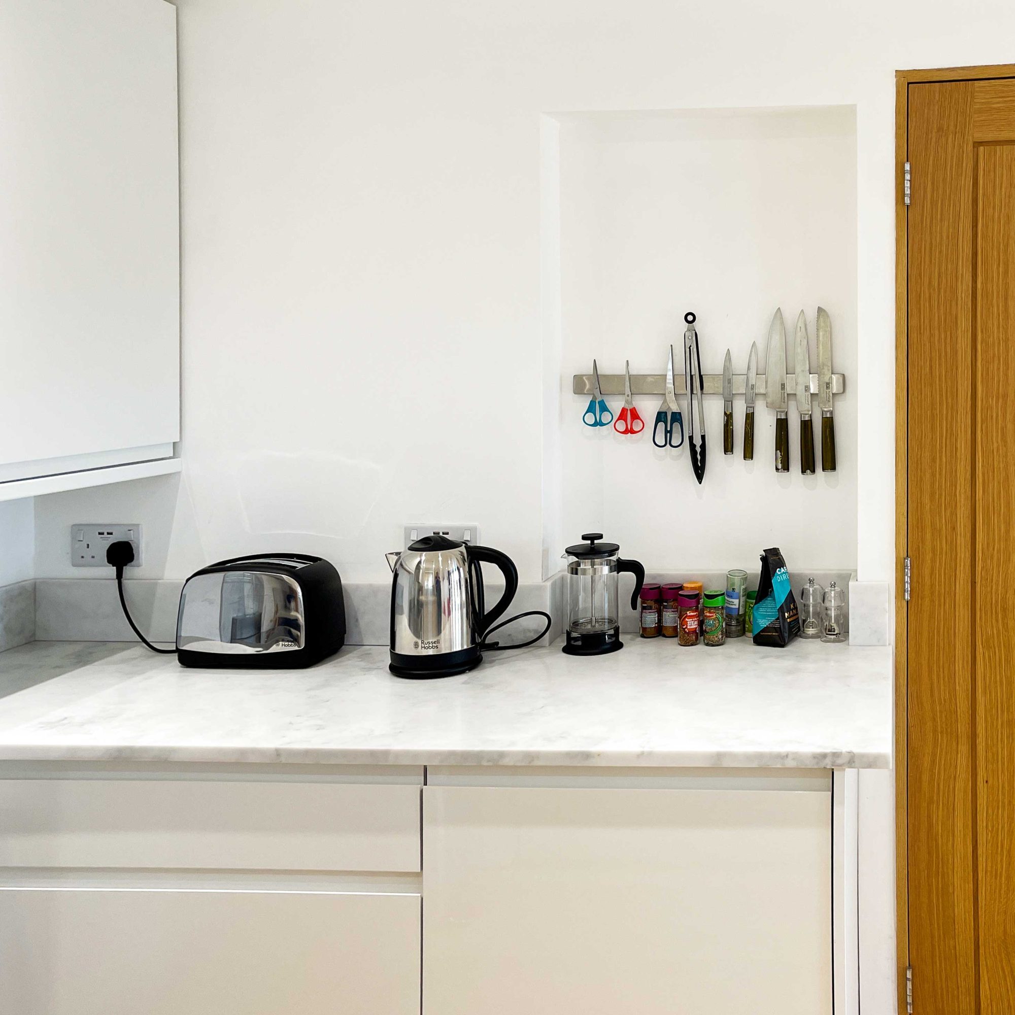 The kitchen has most of the things you would expect at home including a Kenwood mixer in case you wish to really spend time cooking whilst staying in Whitley Old Garage. Or go to or come back from the local pub with a take-away. You do not need any equipment from home including a fully integrated dishwasher, a small microwave, a fridge with small freezer, a freestanding top of the range induction Smeg 600mm wide hob stove with ducted extractor, one and a half integrated sinks in the Carrara Mable style minerva tops. Plates, cutlery, sauce pans etc all in the drawers and cupboards.