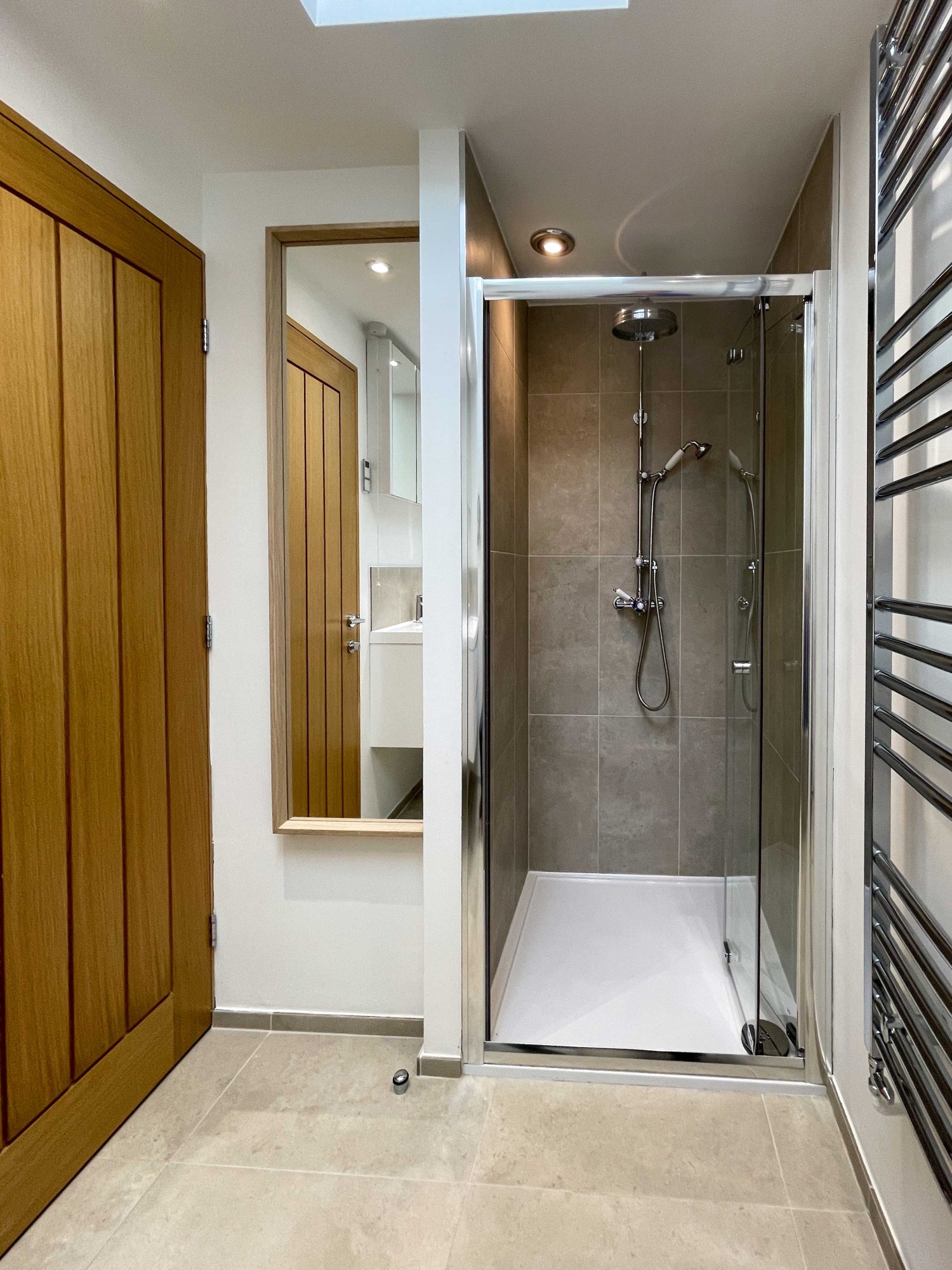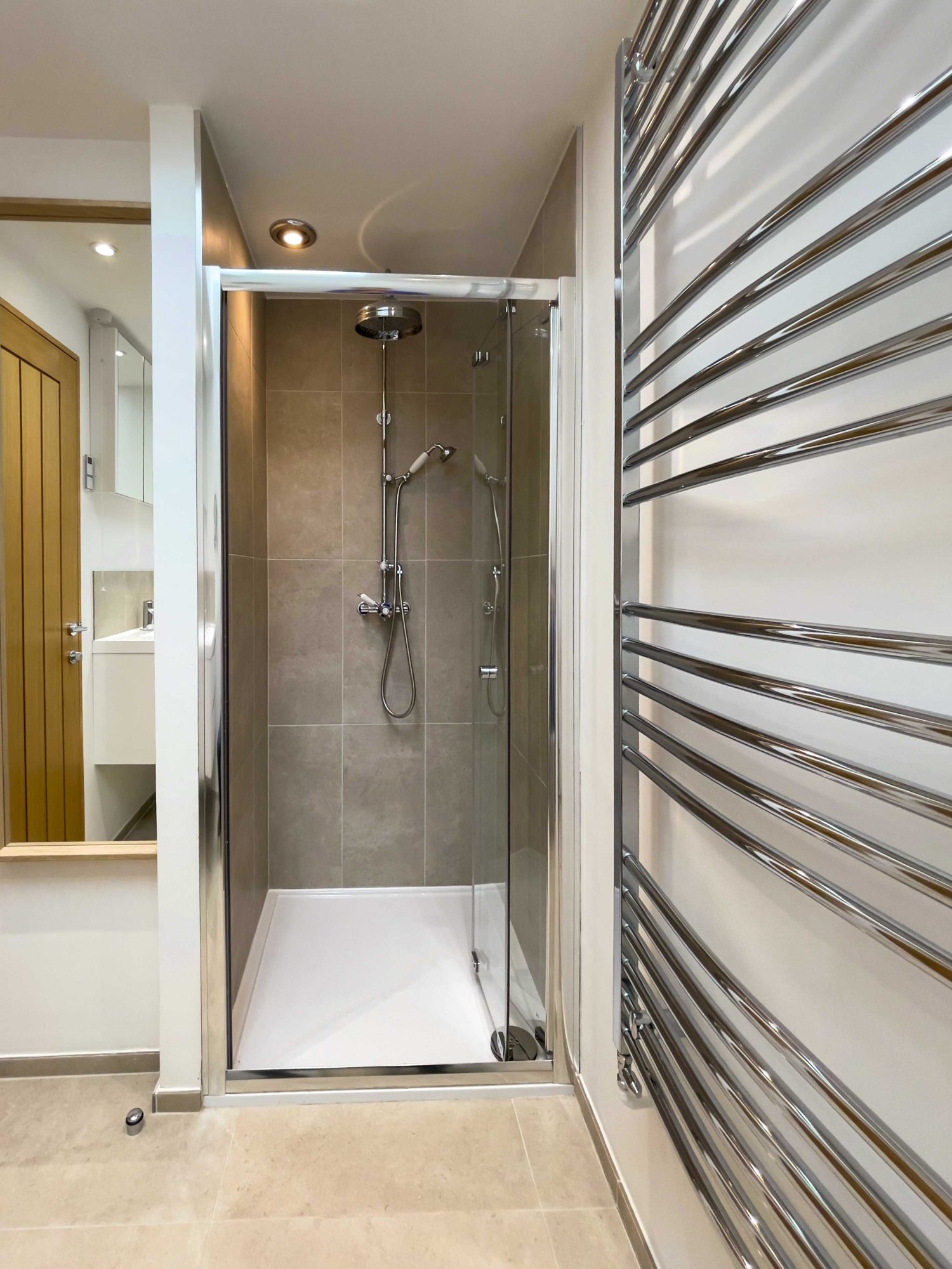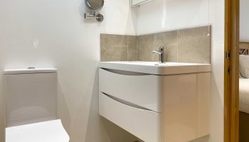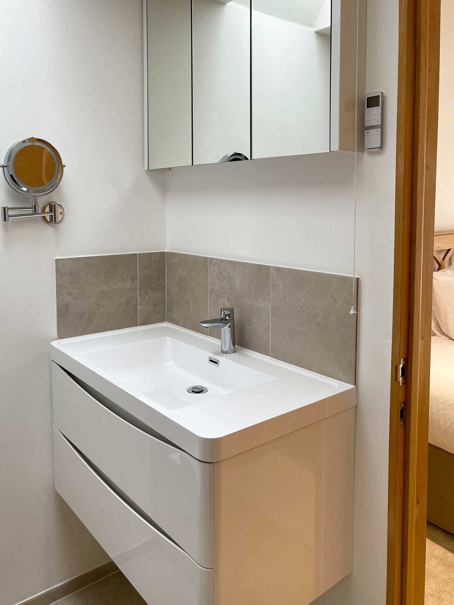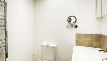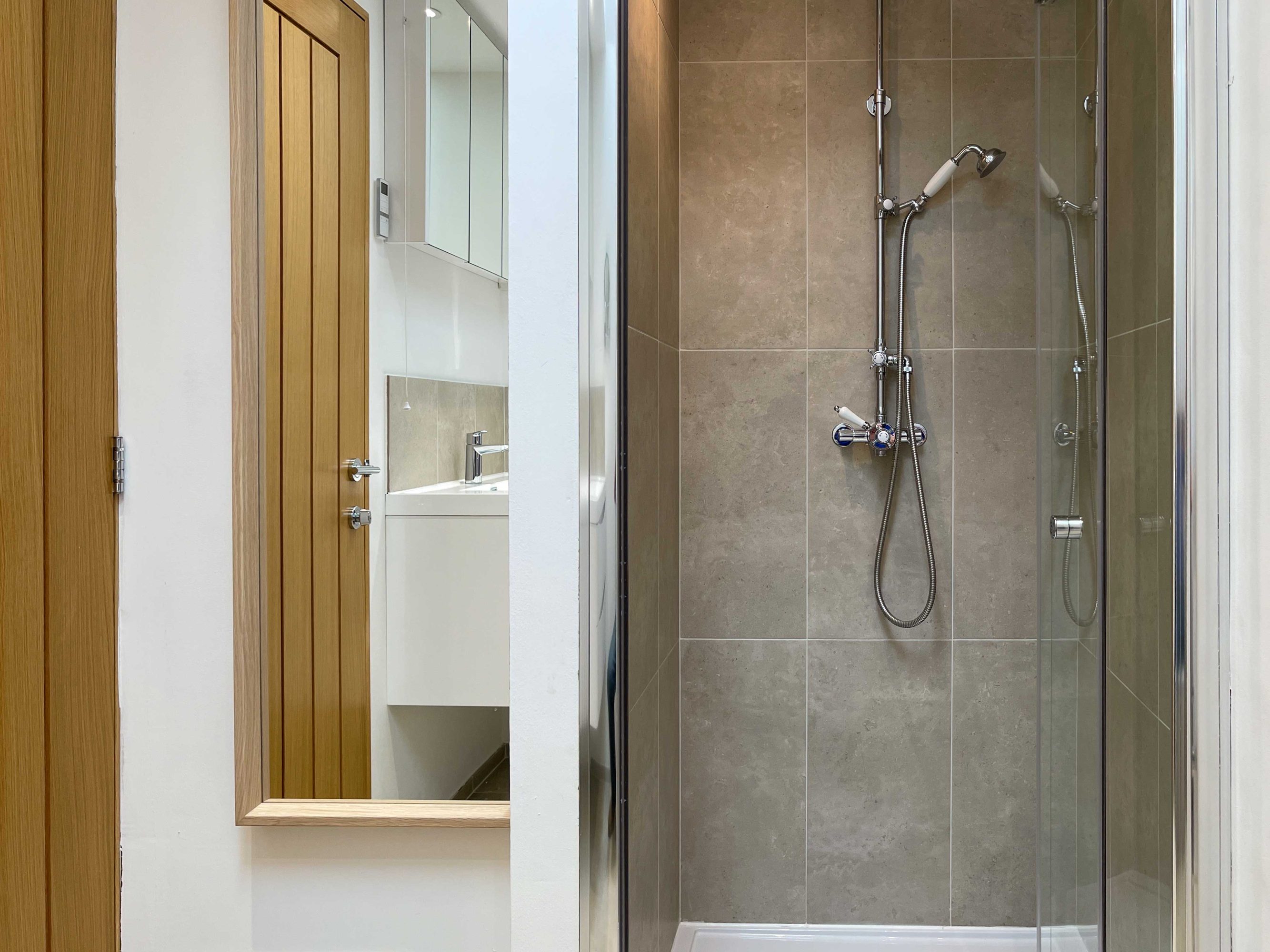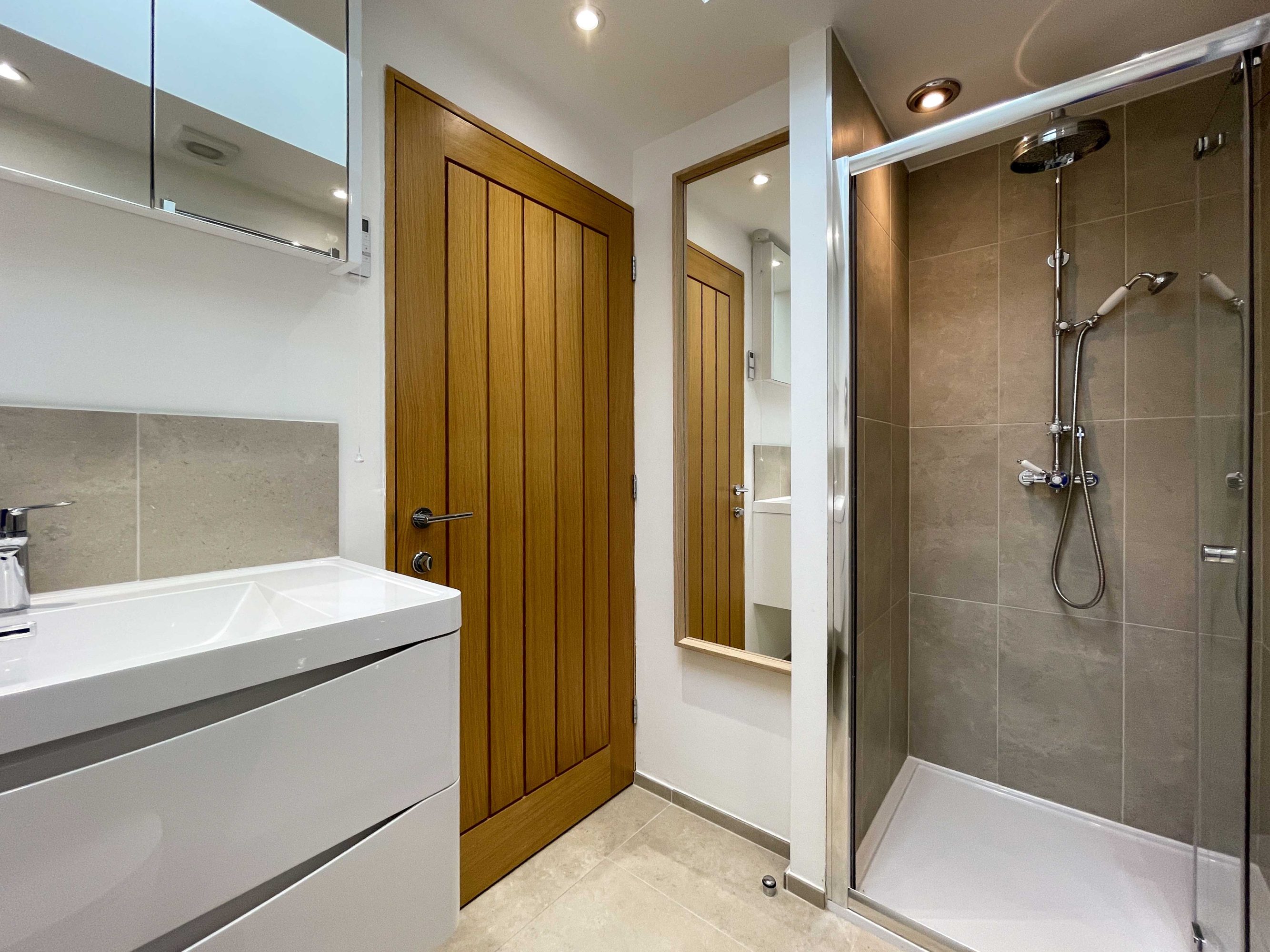 The kitchen has most of the things you would expect at home including a Kenwood mixer in case you wish to really spend time cooking whilst staying in Whitley Old Garage. Or go to or come back from the local pub with a take-away. You do not need any equipment from home including a fully integrated dishwasher, a small microwave, a fridge with small freezer, a freestanding top of the range induction Smeg 600mm wide hob stove with ducted extractor, one and a half integrated sinks in the Carrara Mable style minerva tops. Plates, cutlery, sauce pans etc all in the drawers and cupboards.
