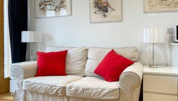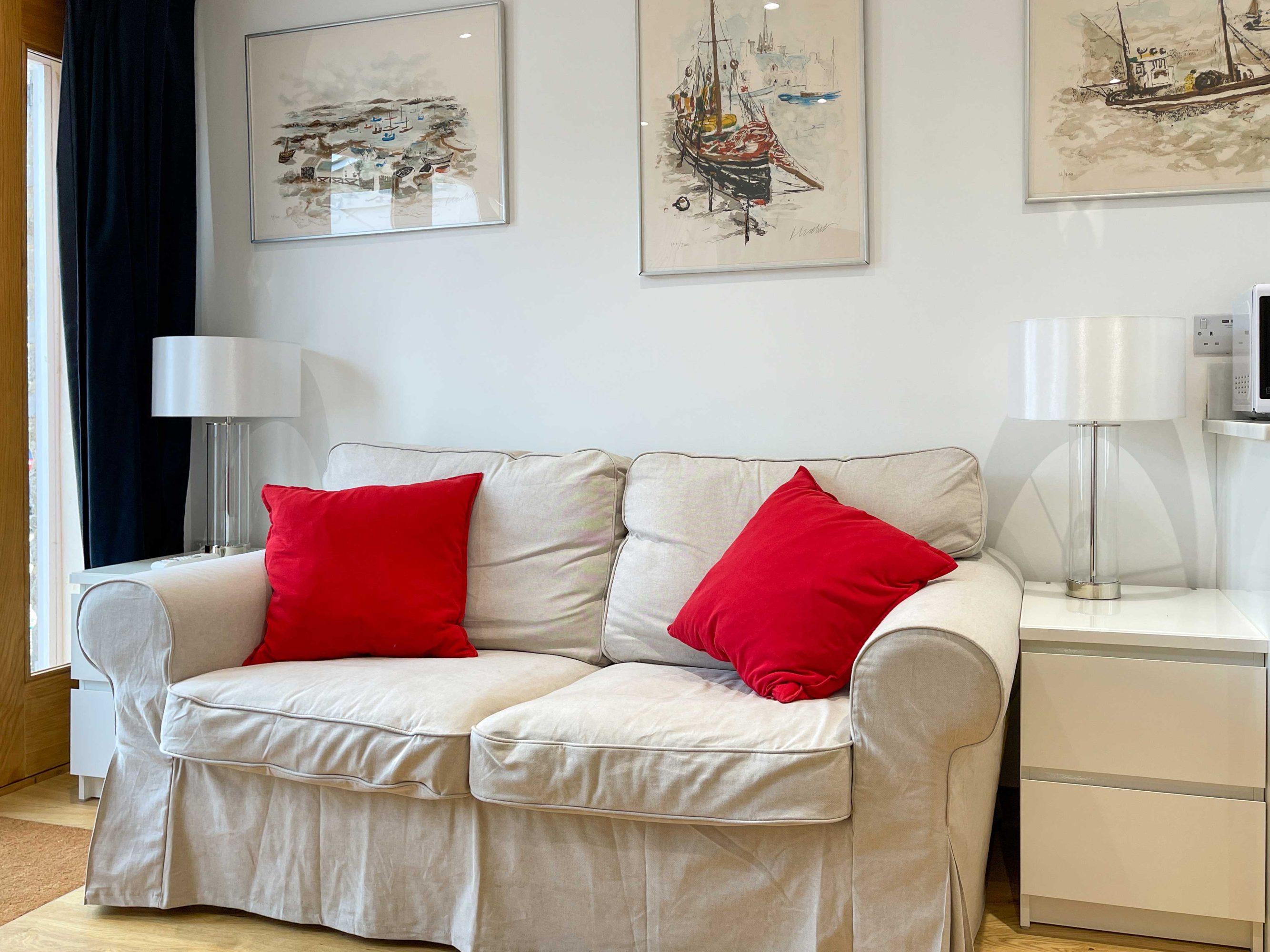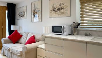 Whitley Old Garage self-catering accommodation/holiday rental has a cosy bedroom with a super king-size (5ft 6ins x 6ft 6ins) bed with a supremely comfortable Vi-Spring handmade pocket sprung mattress. The living room/kitchen/dinner/office area is extremely cosy with a two seater sofa.