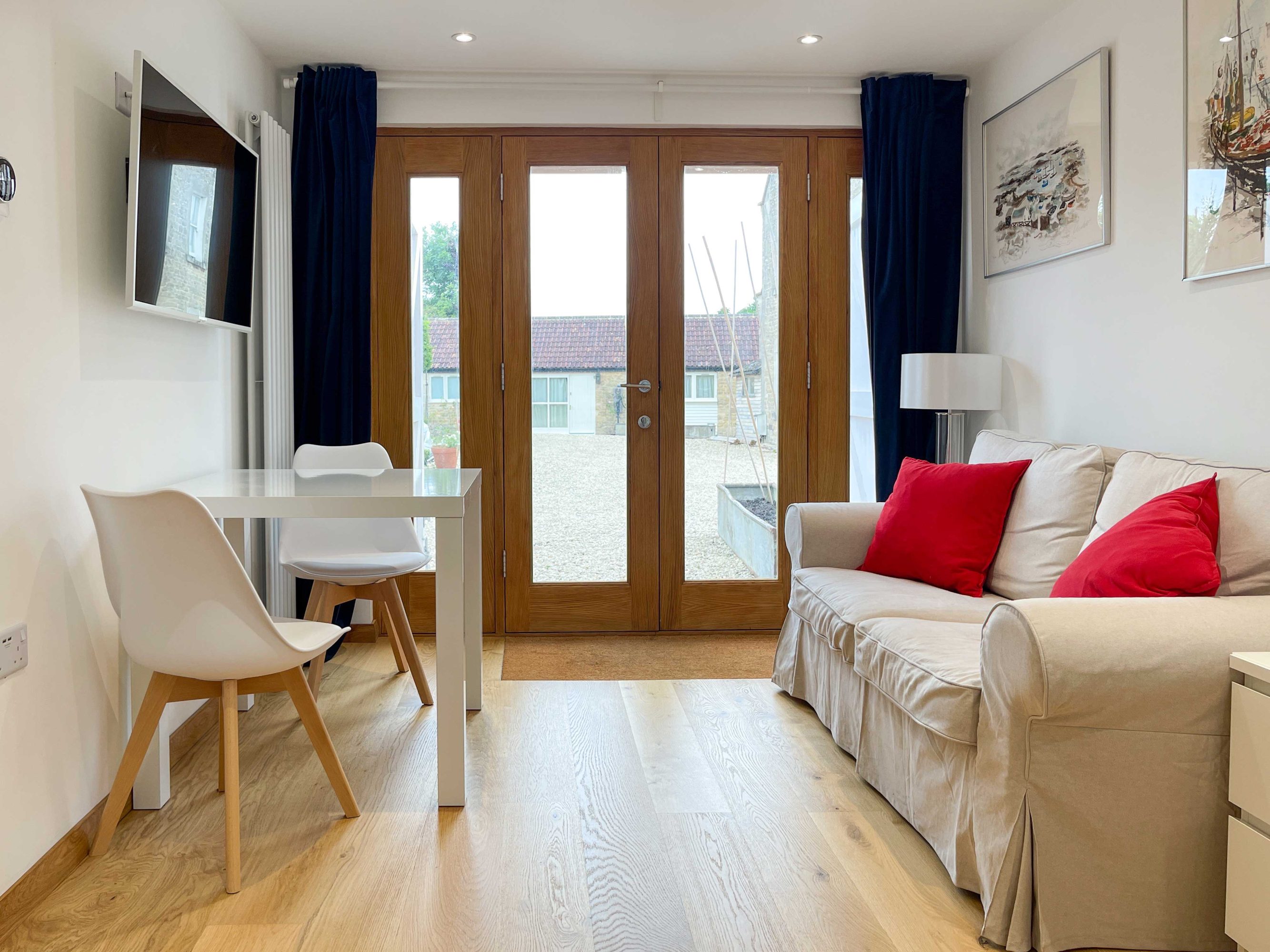 Whitley Old Garage is a former large double garage to a Georgian house built in 1808, converted to luxurious cosy holiday accommodation in 2019/2020. It includes a two seater sofa in the kitchen/living room with a view of the entrance with its tree seat and large rose bed behind. The kitchen is equipped with a dishwasher, microwave, cooker with four halogen rings and most things you would expect at home. The table can be used to work at or relaxed eating with very comfortable modern chairs.