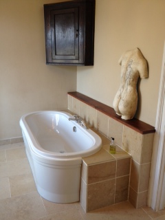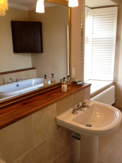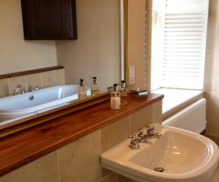 Venture up the stunning circular oak staircase leading to the two en-suite bedrooms on the first floor. A beautiful four poster bedroom with spacious bathroom with separate bath and shower and travertine heated flooring. The second bedroom is stylishly decorated, has a large double bed (or twin beds), two large sunny windows overlooking the front of the manor and a shower en suite. Additional beds/cots can be placed in either room.